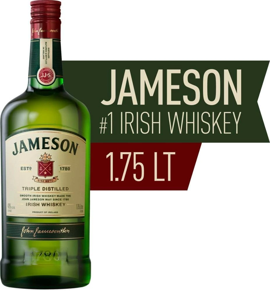 Botella de Jameson, whisky irlandés triple destilado, suave y equilibrado, con notas de vainilla, madera tostada y un final ligero. Ideal para compartir y celebrar.